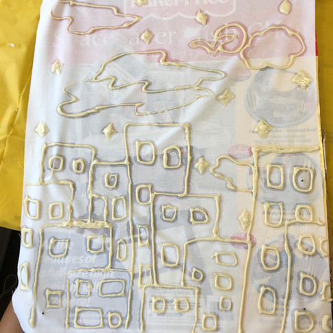 Using the bag like a pastry bag, squeeze the design on to the fabric. You can make a sketch ahead of time to trace over repeatedly (like the sail boats), or make an inspiration sketch and then free hand draw it on the fabric (like the buildings) or just go wherever inspiration takes you (like the squiggles).