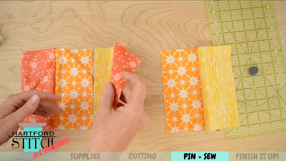 7. Head on back to your prep table and repeat that last step with the third pair. After sewing you should have one long strip.